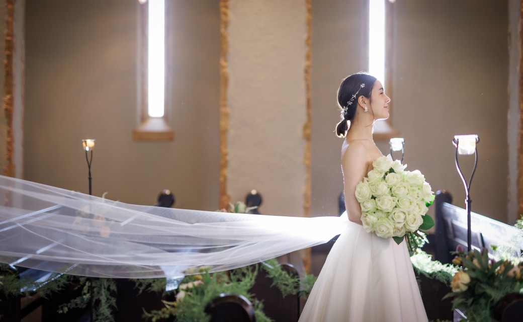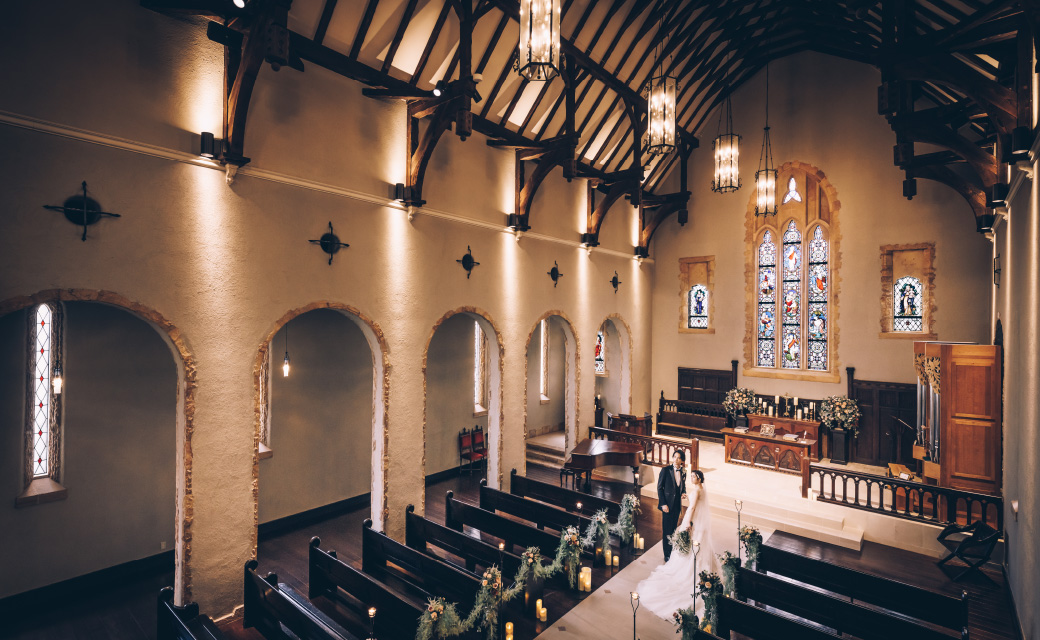 天井高18m、バージンロードの長さが15mの壮大なチャペルをご見学いただきます。教会の神聖な空気を体感してください。