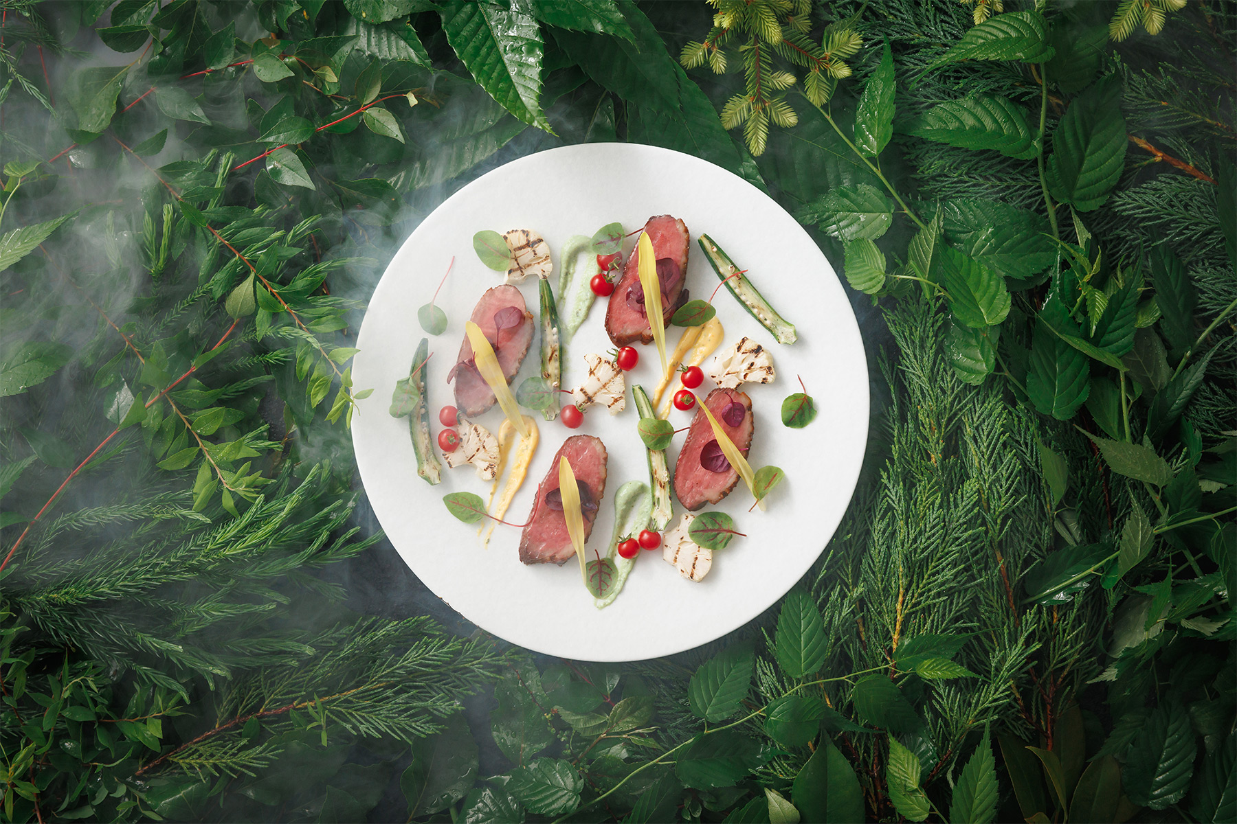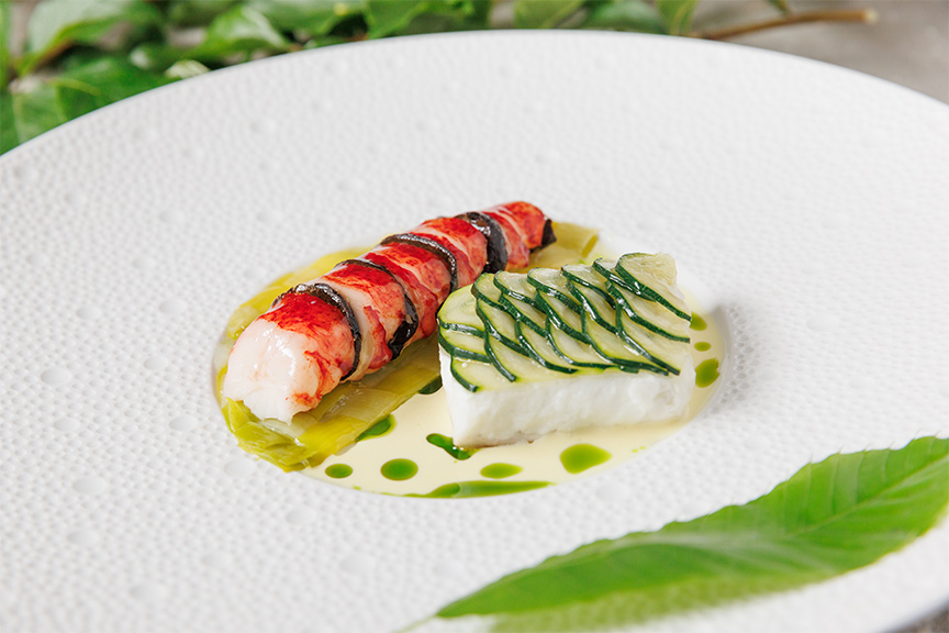旬の素材をふんだんに使った季節感あふれるメニューは、朝の森のような瑞々しさ。阿蘇の深い森の豊かさを感じさせるひと皿です。